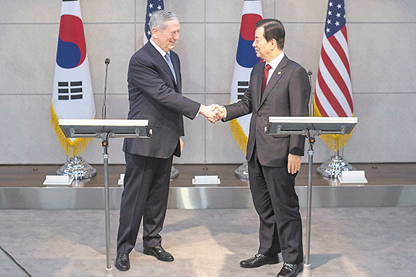 韩国国防部指,马蒂斯在会上重申美国对盟友韩国的协防承诺,优先处理朝鲜核威胁问题,并会采取防御措施保护韩国人民及驻韩美军。马蒂斯与韩民求会谈期间,就朝鲜去年核试及试射导弹交换意见,评估相关安全风险,双方一致认为韩国保持有力的协防措施至关重要,因此美国决定为韩国提供延伸威慑力,如期在今年内于韩国部署“萨德”导弹防御系统,并已商讨具体日程。韩国防部强调,部署“萨德”系统只是针对朝鲜的导弹威胁,无意针对其他地区。