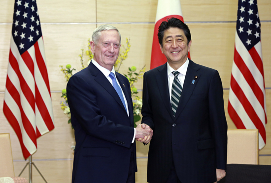 美国防长马蒂斯3日与日本首相安倍晋三在东京会谈\美联社