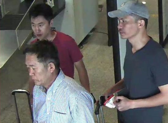 图:(从左至右)三名朝鲜疑犯洪松学、李在男、李志贤13日已离开马来西亚。路透社