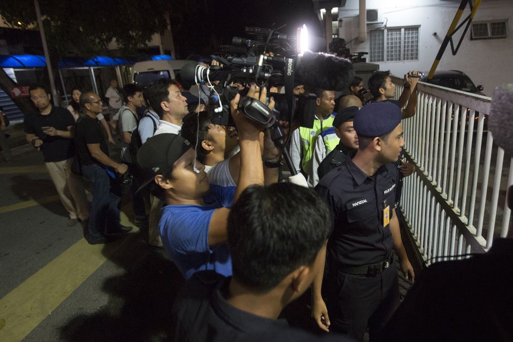大马警员21日在停尸间门口拦住骚动的传媒人士/美联社