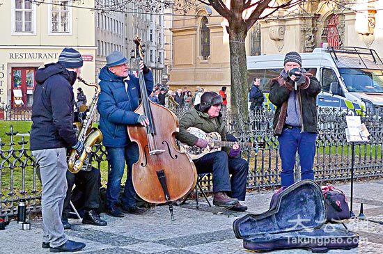 玩音乐无年龄界限,中年以至长者音乐师于街头演奏,在捷克随处可见。作者供图