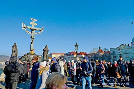 多尊充满宗教味道的雕塑安坐在查理大桥上,吸引游人观赏。作者供图