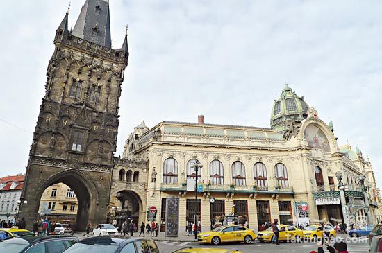 查理大桥前的火药塔(左),已成为进出大桥的地标。旁边的“市政厅”被视作布拉格城自治的象征,是当年议会的所在地,今已成商店,改称为旧城市政厅。作者供图