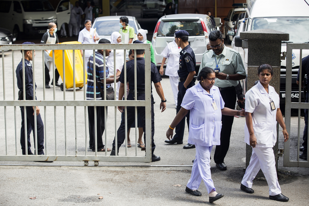 图:大马警方把守停放金正男遗体的医院 美联社