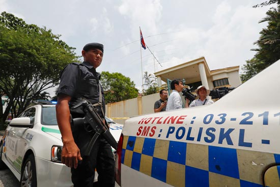 朝鲜驻马来西亚大使馆门口围着大批记者,大马警方表示不会强行拉人,但会一直等朝方交出嫌犯。美联社