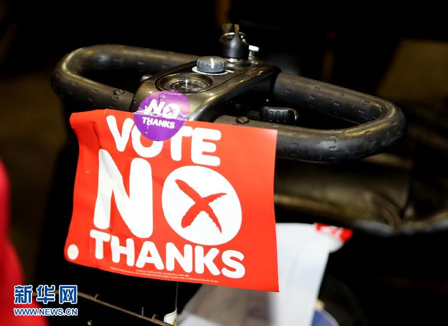 资料图:9月19日,在苏格兰爱丁堡,反独立阵营支持者将“不,谢谢”的标语贴在轮椅上。 英国苏格兰独立公投统计结果当日揭晓,苏格兰独立被否决。新华社记者韩岩摄