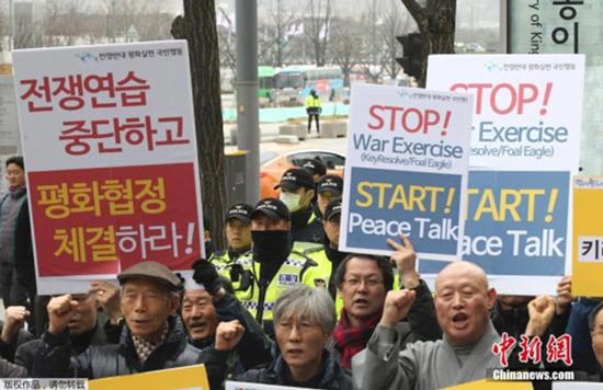 3月7日,韩国民众在美国驻韩国大使馆前举行反战集会,抗议韩美举行联合军事演习。中新社
