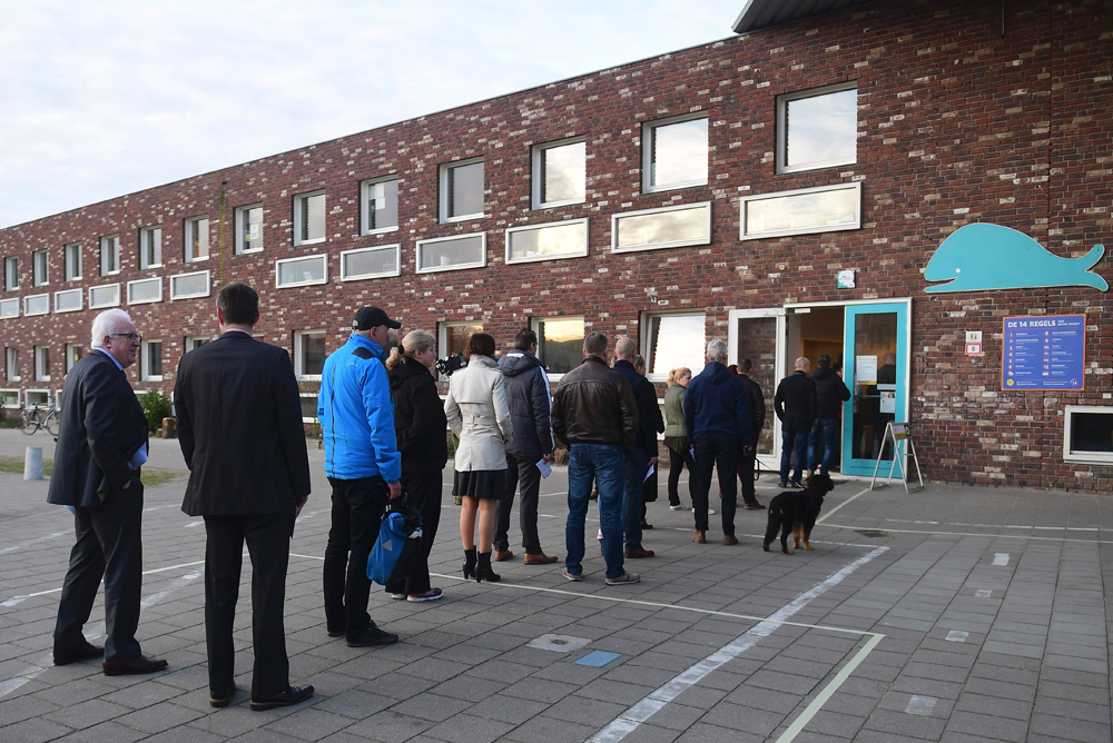 图:民众15日在海牙一个票站外排队投票 /法新社