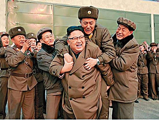 朝鲜最高领导人金正恩(中)让测试的功臣爬上他的背。网上图片