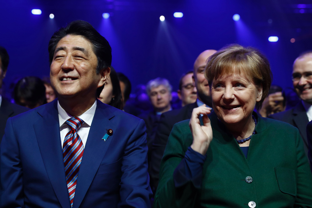 图:安倍晋三(左)与默克尔19日共同提倡自由贸易/法新社