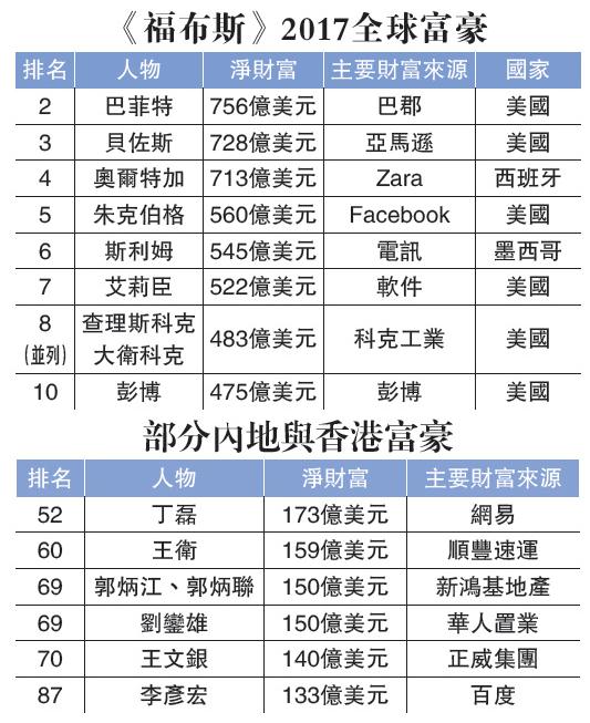 中国首富继续由万达集团王健林夺得,连续第二次入选全球20大富豪,坐拥313亿美元,继续排第18位。香港首富、长和集团主席李嘉诚,则以312亿美元排全球19位,较去年上升一位。