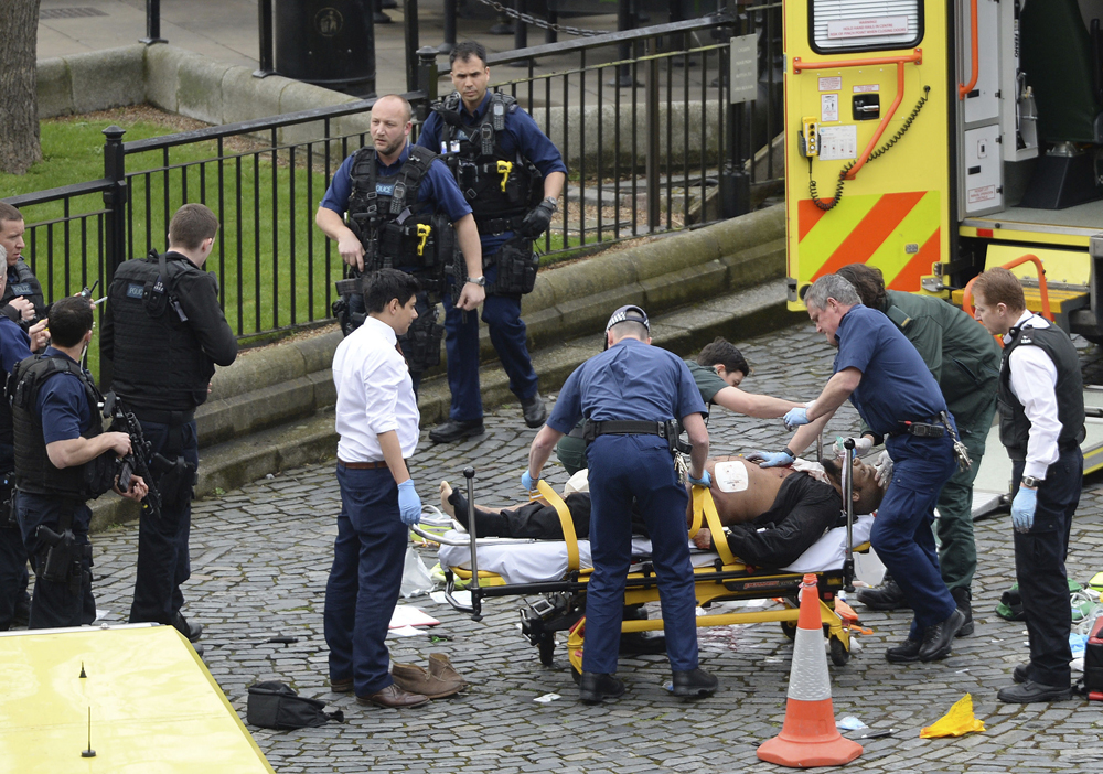 图:英国警察帕尔默被恐嫌刺伤后,救援人员对他进行急救\美联社