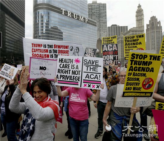 图:特朗普的反对者24日在芝加哥集会,抗议医改 美联社
