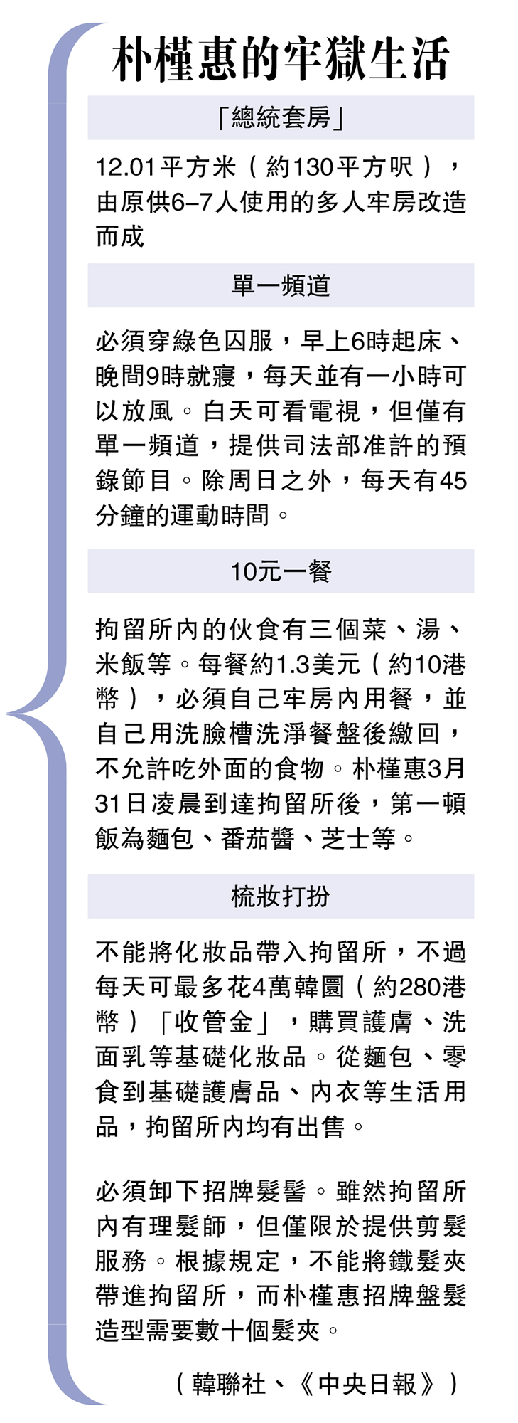 朴槿惠被送入单人牢房后,将过上早上6时30分起床、晚间9时就寝作息的生活。她的单间牢房面积为12.01平方米(约130平方尺)。这个面积的牢房原来是6人房,也是亲信门主角崔顺实等其他囚犯使用的单间牢房(6.56平方米)的2倍。据悉,韩国法务部是考虑到为前总统提供一定程度的礼遇,以及前总统卢泰愚和全斗焕的情况等做出上述决定。