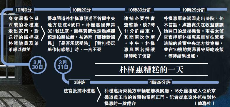 朴槿惠从3月30日上午10时30分起至晚上7时11分接受了8小时41分(包括用餐时间)的口头审讯,随后在首尔中央地方检察厅10楼等候法院裁定。3月31日凌晨3时许,法官批捕朴槿惠。首尔中央地方法院专门负责签发逮捕令的法官康富荣指出,“鉴于主要嫌疑事实确凿、存在湮灭证据之虞,因此对实施逮捕的理由、必要性和合理性予以认可”。