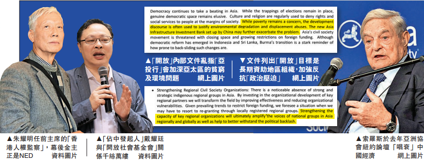大公网4月5日讯(记者施文达)“占中发起人”之一戴耀廷早前被本报(大公报)揭发与索罗斯“泵水”机构“开放社会基金会”关系千丝万缕,本报细查网站DC Leaks披露的“开放”机密文件再有发现,显示“开放”针对“一带一路”融资银行“亚投行”发表不实负评,“开放”亚洲团队2014年成立后,致力透过港大推出“高等教育支持计划”等有关人权领袖培训课程,再扩大受资助地区组织的规模,加强政治反对势力。DC Leaks亦披露“开放”紧密伙伴包括美国国会拨款的“国家民主基金会”NED。NED是另一“占中发起人”朱耀明任前主席的“香港人权监察”幕后金主,子组织NDI曾被揭资助戴耀廷建立“港人讲普选”网站。”