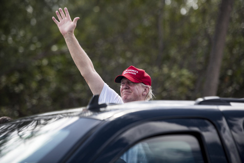 图:3月4日,一身便装的特朗普在去棕榈滩海湖庄园的路上向支持者招手/美联社