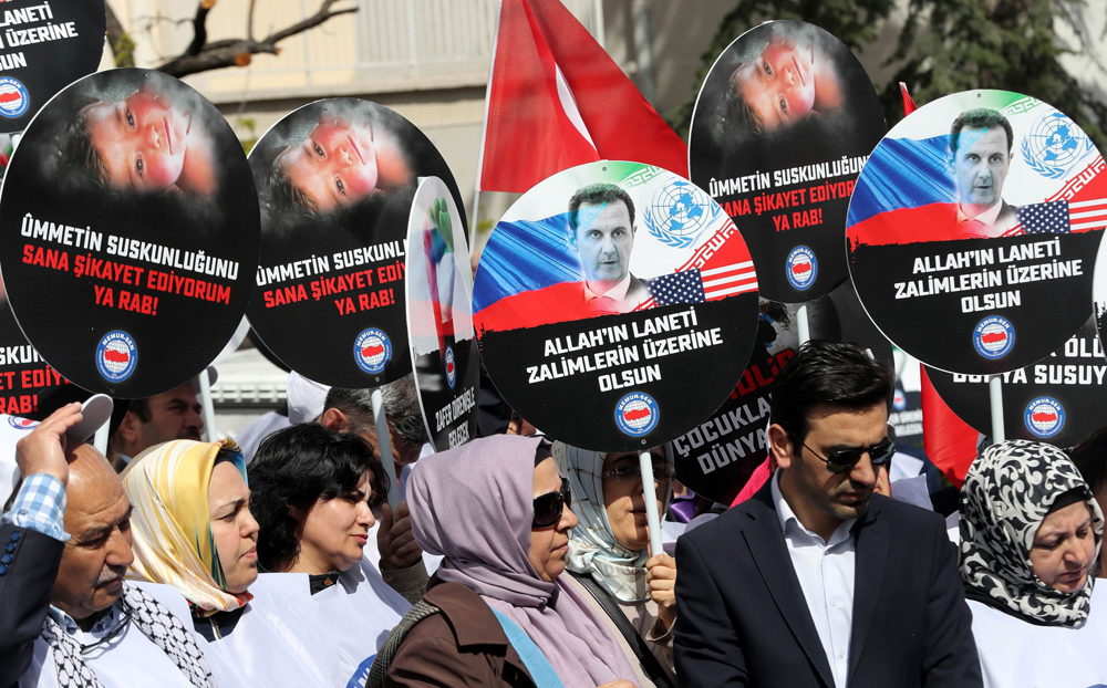 图:叙利亚民众走上街头抗议俄罗斯在化武袭击中起到的所谓“作用”\法新社