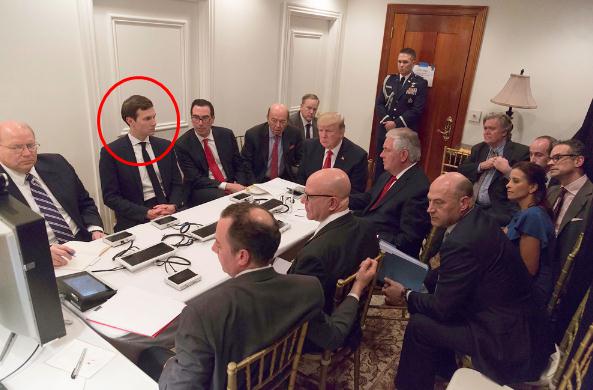 除了特朗普的果断行事让人感到震惊之外,他女婿库什纳在未经通过安全检查的情况下就参与重大决定的决策过程,也让不少人感到惊讶。据悉,在白宫流出的照片中,这位早前被指“通俄”的美国第一女婿已经和一众白宫高级官员同坐战况室商讨军情了。而且,照片中的他似乎“心不在焉”,所有人都盯着屏幕看的时候,库什纳却望向另一边。