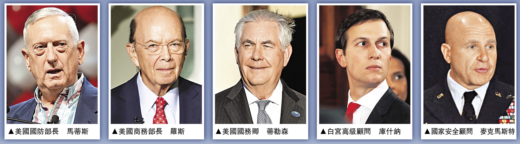 《华尔街日报》分析,现时有五位幕僚正在塑造美国政府新的外交政策。他们是美国国务卿蒂勒森、国防部长马蒂斯、白宫国家安全顾问麦马斯特、商务部长罗斯,以及白宫高级顾问库什纳。分析指出,他们整体稳定了新政府的策略思维,将其推向更传统的轨道。