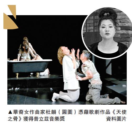 【大公报讯】综合法新社及中通社报道:美国新闻界最高荣誉普利策奖一向只开放予美国传媒及公民报名,但今年却出现华裔脸孔,生于上海、常驻纽约的中国女作曲家杜韵,凭作品《天使之骨》获颁创作类音乐奖。