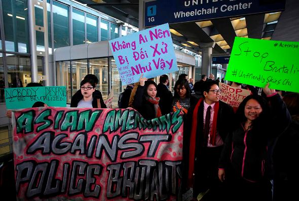 图:华人团体11日在芝加哥机场进行示威/法新社