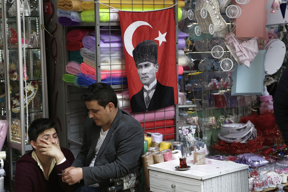 图:土耳其商贩在店里悬挂国父凯末尔的画像/美联社