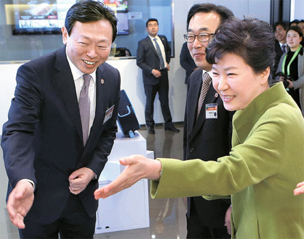 图:朴槿惠(右)与辛东彬(左)2015年3月出席釜山创造经济创新中心落成仪式/网上图片