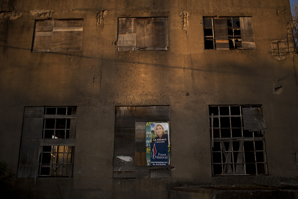 图:阿扬日一处废弃厂房上贴着勒庞的海报/美联社