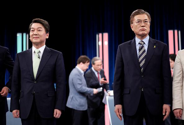 图:文在寅(右)与安哲秀23日参加一场电视辩论 美联社