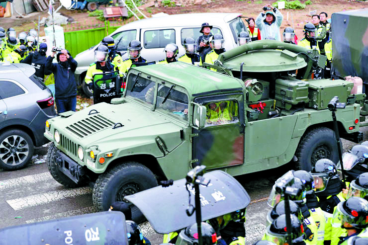 图:驻韩美军的军用卡车26日将“萨德”部件运往目的地 美联社