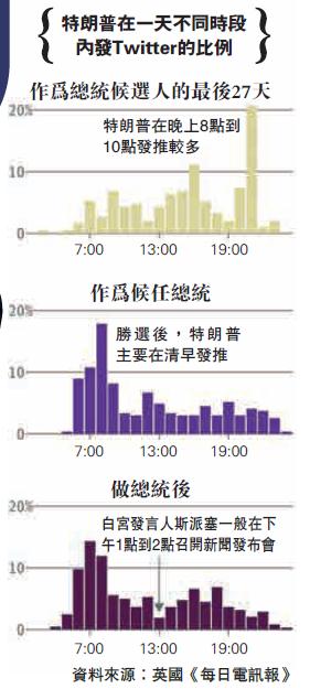 在特朗普上任以来发布的推文当中,涉及到“假新闻”的推文最多,达到30次。做总统前,特朗普大多会在夜晚发布推文;自从成为候任总统以后,他的发推时间也变成了每天清早。