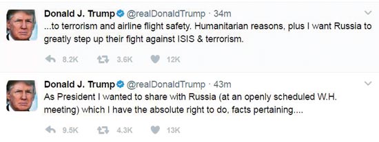 特朗普周二在推特上扞卫自己称,作为总统,他有“绝对权力”与俄罗斯分享“有关恐怖主义”和航班安全的“事实”,因为他想让俄罗斯加大打击ISIS和恐怖主义的力度,但他并未说明他是否有透露有关ISIS的机密。