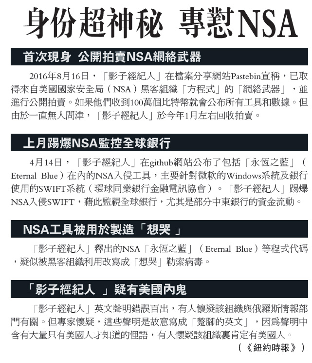 大公网5月18日讯 综合路透社、英国《卫报》、科技网站CNET报道:与近日肆虐全球的勒索病毒“想哭”(WannaCry)有关的神秘黑客组织“影子经纪人”(Shadow Brokers),16日突然发放声明,扬言从6月开始以付费订阅模式,出售更多来自美国国家安全局(NSA)的新黑客工具和情报,可针对微软Windows 10操作系统,还威胁公布中国、俄罗斯、伊朗和朝鲜等国的核计划信息。