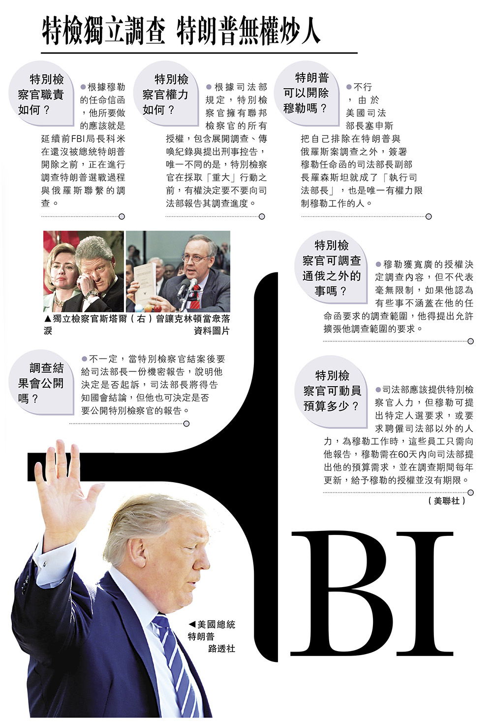 穆勒曾担任过联邦检察官,在2001年至2013年期间担任小布什和奥巴马政府的FBI局长,是科米的前任,以硬朗形象著称。穆勒临危受命,受到了国会部分共和党要员的欢迎。民主党议员在国会设法推动对事件开展独立调查。 特朗普18日连发两条推特,形容是美国有史以来最大的政治迫害。特朗普在推文说:“这是美国有史以来,针对政治人物所进行的最大单一猎巫行动。”特朗普还指控,“虽然希拉里竞选团队和奥巴马政府都有非法行为,但从无特别检察官进行调查。”