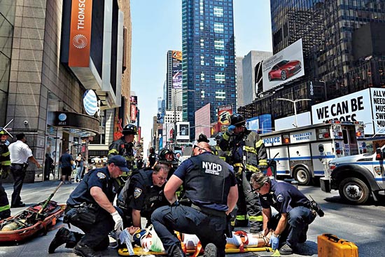 由于事件发生在午餐时间,事发街道聚集了大量游客和出来吃午饭的雇员。很多人在社交媒体上称,看到受伤者被用担架抬走。交通摄像头显示,该区域应急反应升级;至少五辆消防车立刻到达现场,一行警车停靠在时报广场附近的TKTS售票厅。