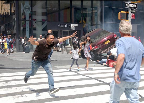 报道指,当天中午12点左右,一辆红色的本田雅阁轿车在接近时报广场时突然做了一个U形转弯,逆向行驶,冲上位于百老汇大街和45街交汇的西边人行道,撞到一众行人后,汽车撞上一个铁栏杆后停下,车前盖冒出白烟并起火。大量受伤行人卧倒在地。目击者称,肇事者试图跳车逃走时,被一名交通执法人员抓住。