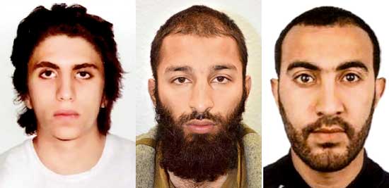 根据英国警方公布的资料,三名恐嫌分别为27岁巴基斯坦裔的英国公民比特、30岁摩洛哥和利比亚裔的勒杜亚纳,以及22岁摩洛哥裔意大利人扎格巴。比特和勒杜亚纳都来自东伦敦的巴尔金。