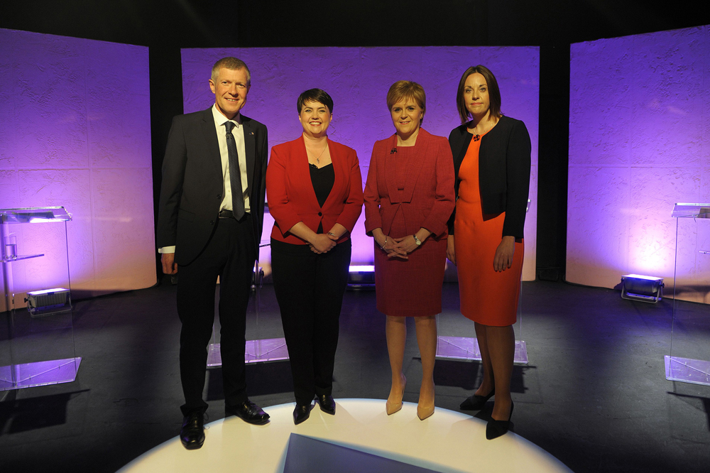 图:(左至右)苏格兰自由民主党领袖伦尼、苏格兰保守党领袖戴维森、苏格兰民族党领袖施雅晴、苏格兰工党领袖达格代尔6日参加电视辩论\法新社
