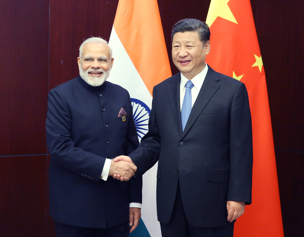 图:9日,中国国家主席习近平在阿斯塔纳会见印度总理莫迪\新华社