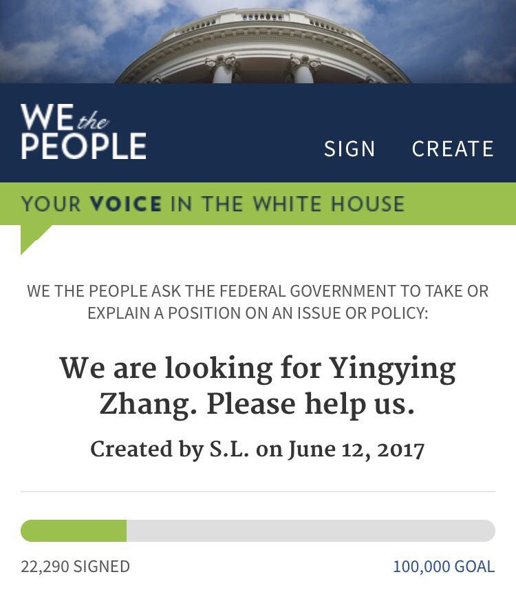 此外,UIUC的校友在白宫请愿网上主动发布“寻找章莹颖”的信息,截至14日上午11时已获逾2万人签名。若能在一个月内获10万签名,美国政府必须作出回应。