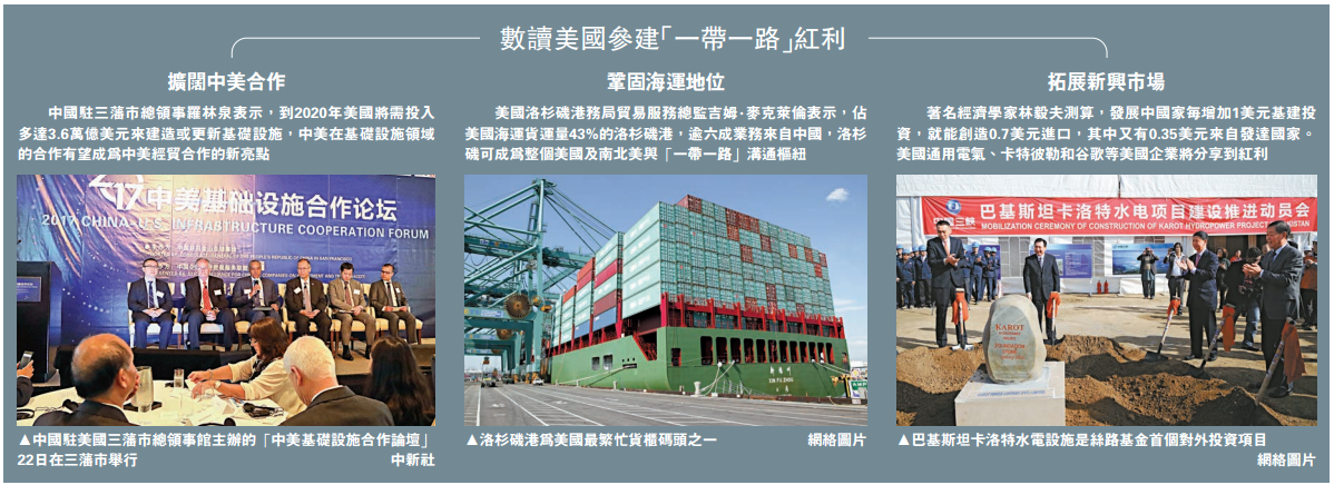 丝路智谷研究院院长梁海明向大公报指出,特朗普抛出1万亿美元的基础设施重建计划冀提振实体经济,然而,从美国科技、工业基础包括人口结构等资源看,难以支撑其单独完成基建重建大计,美国短板正好是中国长板。中国的基建技术、工程能力、工业和价格结构及雄厚的资金能力能与美国的匹配和互补,特别是中国与“一带一路”沿线国家合作往往始于基建,过程中积累丰富海外工程经验。