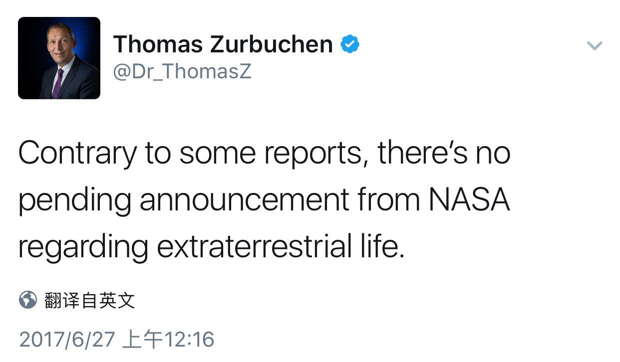 对此,NASA科学任务局副局长楚比兴予以否认。他26日在推特上发文表示,NASA没有要公布涉及外星文明信息的计划。他又称,“我们在宇宙中是孤独的吗?现在还不知道,或许通过继续推进探索就能找到答案。”