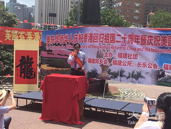 约数十个闽籍社团于7月1日在纽约联合举行庆祝香港回归祖国二十周年花车大游行,游行队伍从纽约华埠出发,途经中国驻纽约总领馆、时代广场、联合国等地标,所经之处,万众瞩目,将纽约庆祝香港回归系列活动推到高潮。图为花车大游行启动仪式上,活动策划人郑时甘在致词(记者黄晓敏摄)