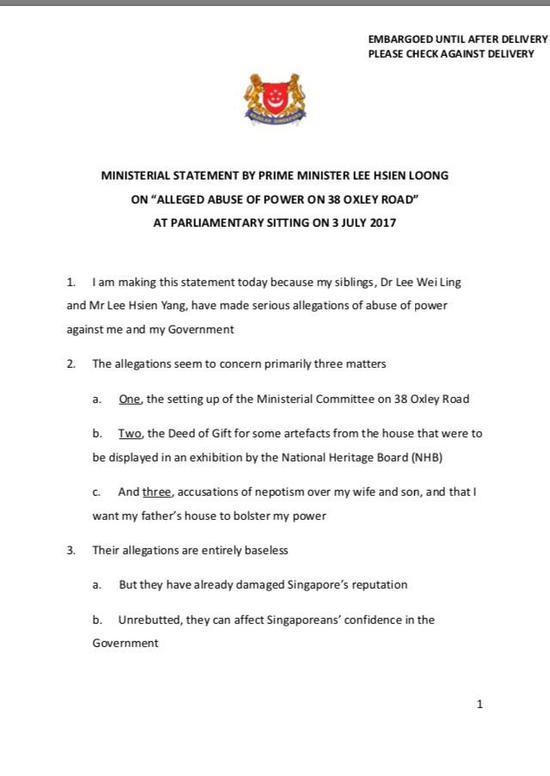 李显龙3日在国会发表题为“欧思礼路38号:滥用权力的指控”的声明。