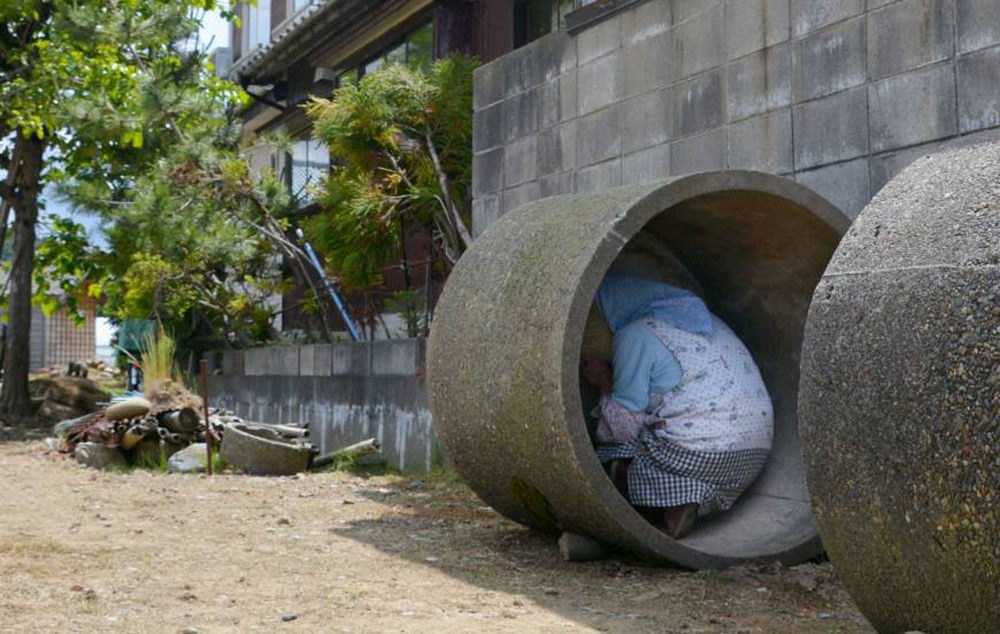 图:日本上月在新滹市举行躲避导弹演习,一名老妇人躲在水泥管内\共同社