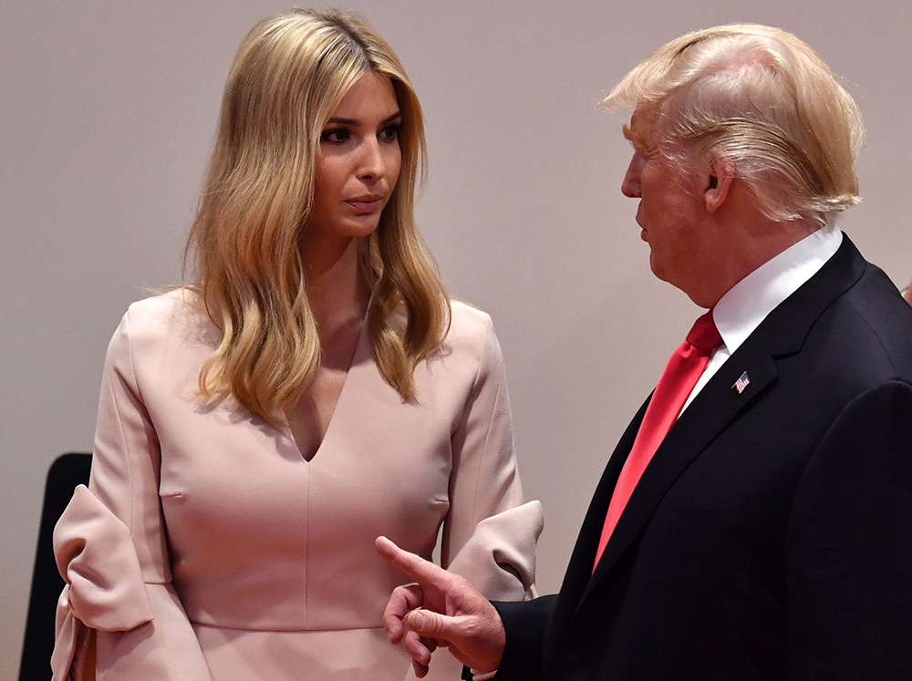 图:特朗普与伊万卡在8日的一场峰会会议上交谈\法新社