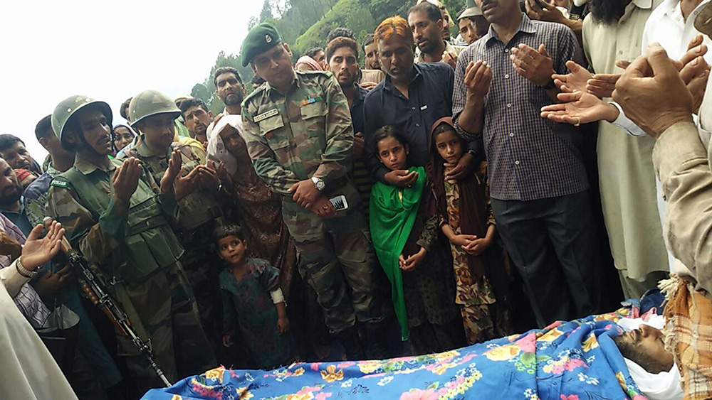 图:印度民众为8日印巴交火中死亡的士兵举行葬礼\法新社