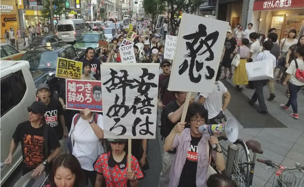 过去一个周末,东京、大阪、福冈及名古屋等地均有民众聚集抗议。9日,8000多名市民聚集在东京新宿车站附近发起游行,抗议自民党此前在质疑声中强推《有组织犯罪处罚法》修正案,反对“安倍独大”,要求首相下台。示威者指控安倍政府仗着议席优势,绕过议事程序通过法案,无视民众声音。有示威者举牌指“我们反对滥用政治”,并要求国会举行特别会议再讨论法案。同日,一个来自早稻田大学的学生团体亦在新宿抗议示威,反对安保相关法案,约有650人响应。