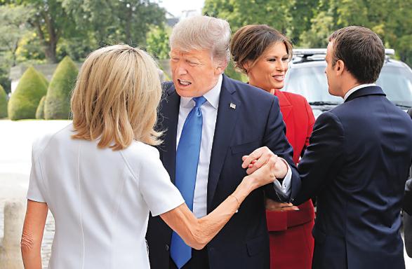 图:特朗普(左二)13日抵达荣军院时问候法国第一夫人布吉丽特(左)/法新社